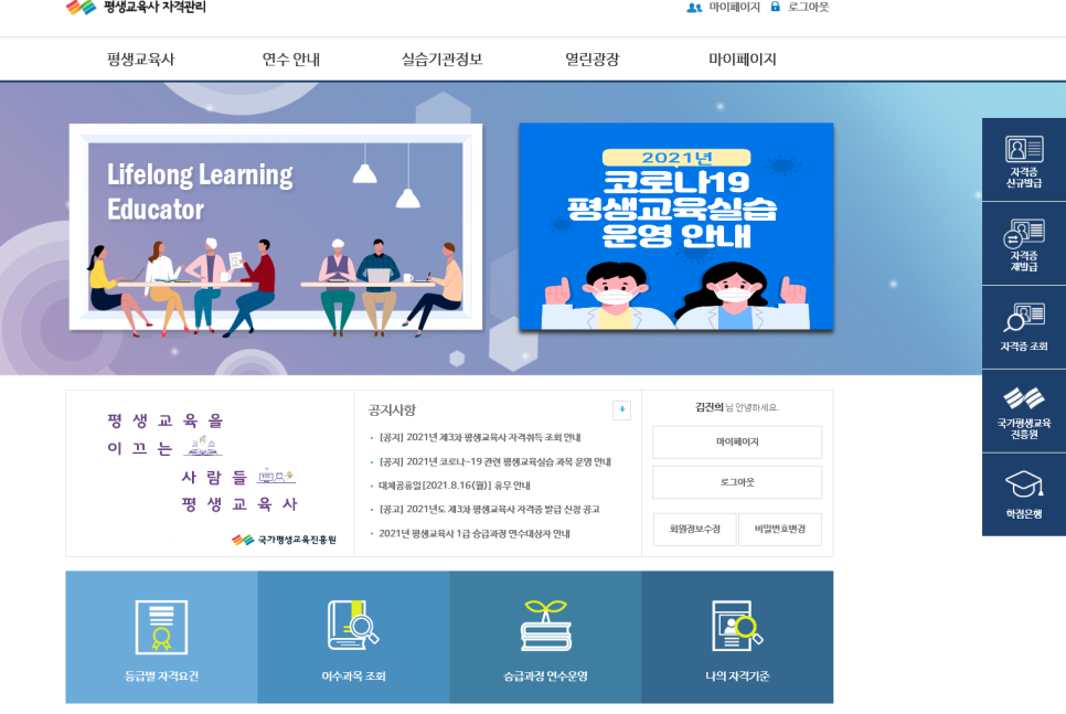 우선 평생교육사 자격관리 홈페이지에 접속한다. https://lledu.nile.or.kr/